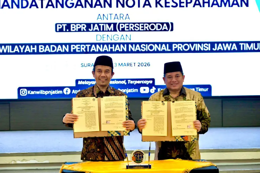 Indonesia Menyapa, Surabaya — Bank UMKM Jatim (PT BPR Jatim Perseroda) kembali memperkuat kolaborasi dengan Kantor Wilayah Badan Pertanahan Nasional (BPN) Provinsi Jawa Timur untuk memperluas akses pembiayaan bagi masyarakat. Kerja sama tersebut ditandai dengan penandatanganan Nota Kesepahaman (MoU) di Kantor Wilayah BPN Jawa Timur, Jumat (13/3/2026).